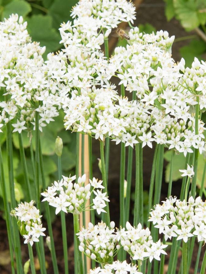 Allium tuberosum, známý jako česneková pažitka, roste nejlépe na plném slunci a v dobře propustné půdě. Tato vytrvalá bylina kvete od konce léta do podzimu s bílými květy. Pravidelná zálivka je důležitá zejména během suchých období, aby se zajistil zdravý růst. Listy a květy česnekové pažitky jsou jedlé a mají jemnou česnekovou chuť, často se používají v kuchyni. Prořezávání květů může podpořit nový růst listů. Tato rostlina je atraktivní pro opylovače, jako jsou včely. Allium tuberosum je mrazuvzdorná do USDA zóny 4-8, což znamená, že snáší teploty až do -34°C, což umožňuje její úspěšné pěstování v různých klimatických podmínkách.