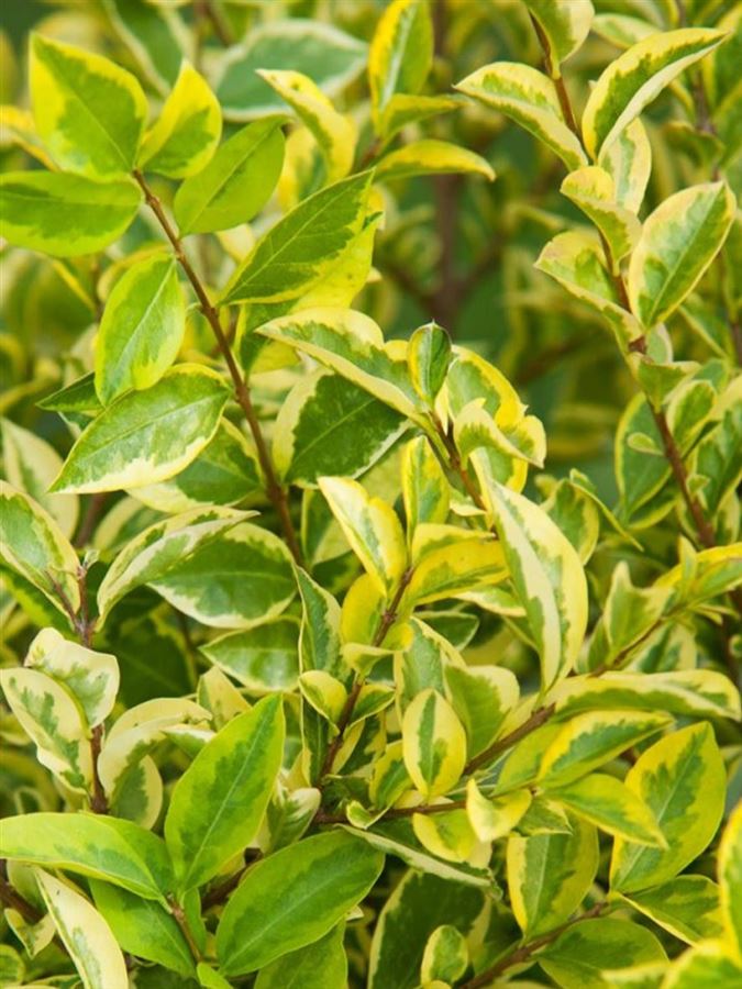 Ptačí zob vejčitolistý 'Aureum' (Ligustrum ovalifolium 'Aureum') je hustě větvený keř s atraktivním panašovaným listem, který v zahradách zaujme po většinu sezóny. Na rozdíl od běžného ptačího zobu má listy žlutozelené s jasně zlatým okrajem, které si udržují barvu i při častém řezu. V našich podmínkách je částečně opadavý – v mírných zimách zůstávají listy na větvích až do jara, v chladnějších oblastech opadává částečně nebo úplně. Keř je oblíbený především pro výsadbu do živých plotů, protože rychle obrůstá, snáší hluboký řez a udržuje kompaktní tvar.