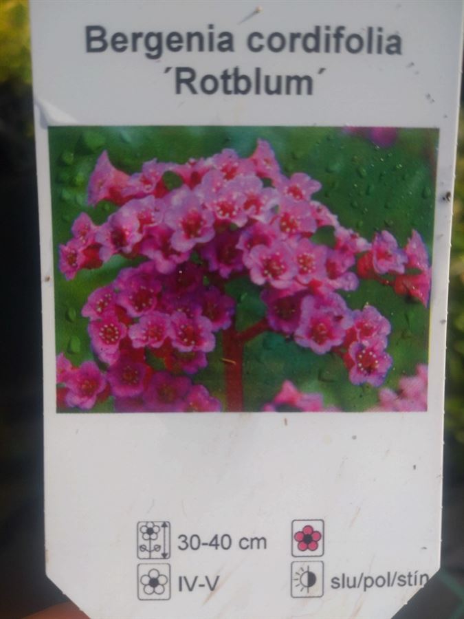 Bergenia cordifolia 'Rotblum' je stálezelená trvalka dorůstající výšky kolem 30 až 40 cm. Kvete na jaře růžovými až červenými květy uspořádanými v hustých latách. Listy jsou velké, srdčité, tmavě zelené, kožovité, které se na podzim a v zimě zbarvují do červena. Tato rostlina je ceněná pro svou dlouhou dobu kvetení a dekorativní listy. Preferuje slunná až polostinná stanoviště a vlhké, humózní půdy. Pravidelné zavlažování je důležité, zejména během suchých období. Mulčování pomáhá udržovat vlhkost a chrání kořeny před extrémními teplotami. Je ideální pro záhony, skalky a okraje záhonů, kde poskytuje celoroční atraktivitu. Není náročná na péči a je vhodná i pro začínající zahrádkáře, netrpí na choroby ani škůdce, je plně mrazuvzdorná do -30°C.