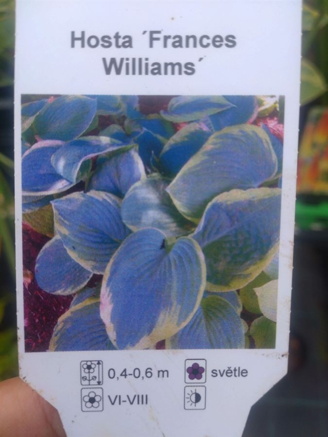 Hosta sieboldii 'Frances Williams' má velké, modrozelené listy s nepravidelnými zlatými okraji. Tato rostlina dorůstá do výšky 60-75 cm a šířky 90-120 cm. Květy jsou bledě fialové a objevují se v létě.