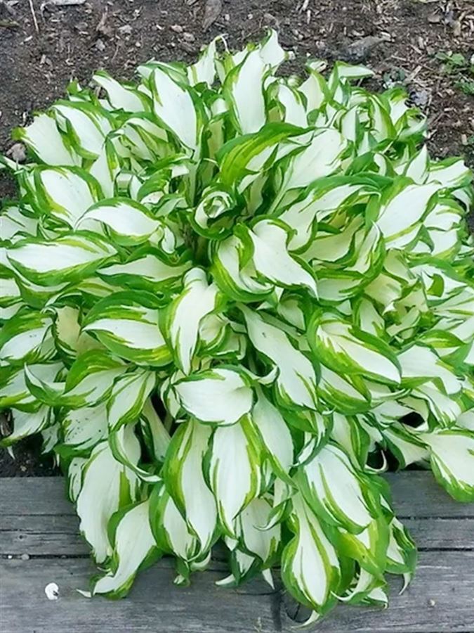 Hosta undulata 'Albomarginata' má zelené listy s bílými okraji a zvlněným okrajem. Tato rostlina dorůstá do výšky 30-45 cm a šířky 60-75 cm. Květy jsou bledě fialové a objevují se v létě.