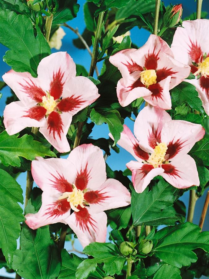 Hibiscus syriacus 'Hamabo' je keř dosahující výšky 2-3 metry. Roste nejlépe na plném slunci a preferuje dobře propustnou, vlhkou půdu. Tento kultivar kvete od léta do podzimu s bílými květy s růžovými pruhy a červeným středem, které dodávají zahradě živý barevný prvek. Pravidelná zálivka je důležitá zejména během suchých období, aby se zajistil zdravý růst. Ibišek je velmi odolný vůči mrazu a nevyžaduje mnoho péče. Je ideální pro živé ploty, okraje záhonů a jako solitérní keř. Prořezávání na konci zimy nebo na začátku jara podpoří nový růst. Hibiscus syriacus 'Hamabo' je mrazuvzdorný do USDA zóny 5-9, což znamená, že snáší teploty až do -29°C.