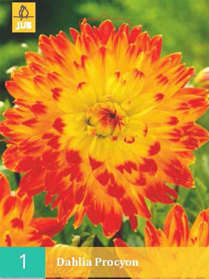 Kultivar Dahlia Procyon patří mezi dekorativní odrůdy jiřinek, které kvetou velmi efektními květy od léta až do prvních mrazů. Ty jsou plně dvojité, až 12 cm široké, žluté s ohnivě červenými špičkami a vykvétají na silných stoncích o výšce až 1 metr. Celá rostlinka pak působí až ohnivým dojmem. Dahlia, neboli jiřina, je hlíznatá trvalka. V našich podmínkách ji pěstujeme jako letničku. Jiřin je spousty druhů, které se liší hlavně svojí výškou a vzhledem květů. Můžeme se setkat s jiřinami do 50cm, ty patří spíše do nádob. Dále se setkáváme s vyššími až do 180cm. Květy mohou být jednoduché, plnokvěté s přísně kulovitým kompaktním tvarem, či střapaté. Některé mají květy větší než mužská dlaň, jsou opravdu veliké. Většinou potřebují oporu. Jiřiny pro své zdraví potřebují slunečné místo s dostatkem vláhy. A to po celé vegetační období. Jiřiny tvoří podlouhlé hlízy, které jsou citlivé na mráz. Kvetou do prvních mrazíků a tak snadno poznáme, kdy máme hlízy vyjmout a uložit na suché a temné místo.
