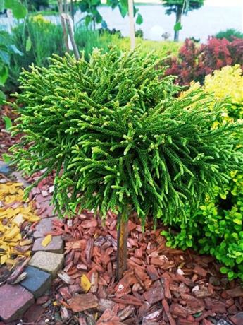 Cryptomeria japonica 'Little Sonja' - kryptomerie pochází původem z Japonska a jedná se povětšinou  o velké stromy, které mohou  dosahovat i 45 metrů. To však od ,,malé Soni,, nečekejte. V dospělosti bude tato slečna potřebovat do výšky jen cca 1 metr  a tak vás ze zahrady rozhodně nevystěhuje. Jedná se o stálezeleného zakrslíka, který má krátké šídlovité listy spirálovitě uspořádané kolem větví a jejich jasně svěží zelená barva se na podzim mění na bronzovou. Ideální bude slunečné stanoviště a propustná hlinitopísčitá  půda. Během sezon přihnojujte hnojivem na stálezelené rostliny a jehličnany. V našich podmínkách je plně mrazuvzdorná.