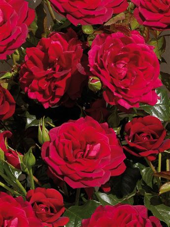 Červená mnohokvětá záhonová růže - floribunda. Zobrazit více