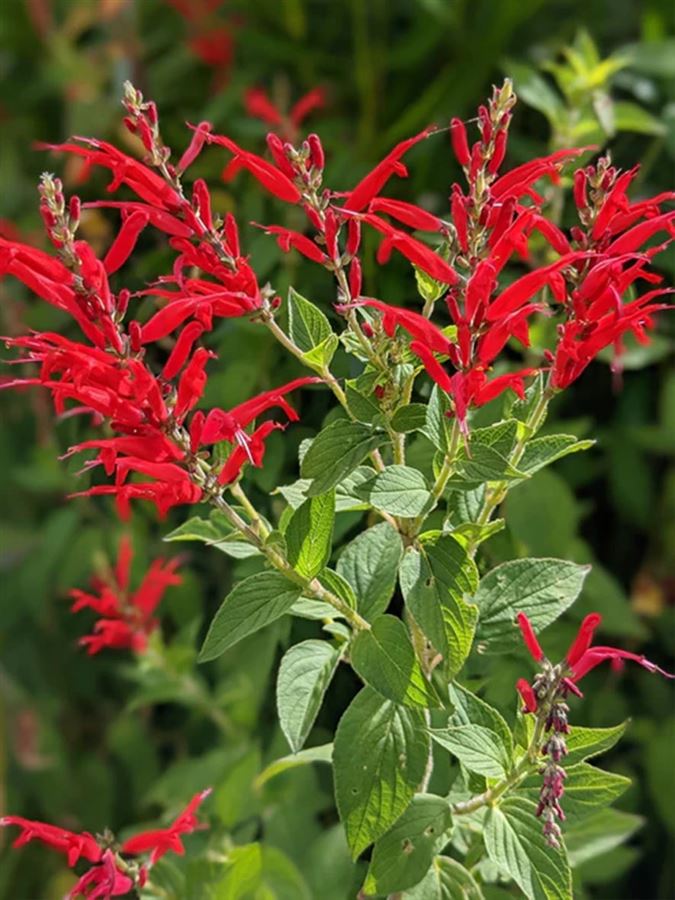 Salvia elegans, známá také jako ananasová šalvěj, je vytrvalá bylina dosahující výšky 1-1,2 metru. Tento druh je ceněn pro své jasně červené květy a aromatické listy s ananasovou vůní, které kvetou od léta do podzimu. Rostlina preferuje plné slunce a dobře propustnou, úrodnou půdu. Je mrazuvzdorná do USDA zóny 8-10, což znamená, že snáší teploty až do -12 °C. Ananasová šalvěj je ideální pro bylinkové zahrady, smíšené záhony a nádoby. Pravidelná zálivka je důležitá během suchých období. Listy jsou často používány v čajích, salátech a dezertních receptech, což z této rostliny činí nejen atraktivní, ale i užitečný doplněk zahrady.
