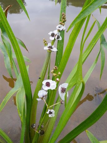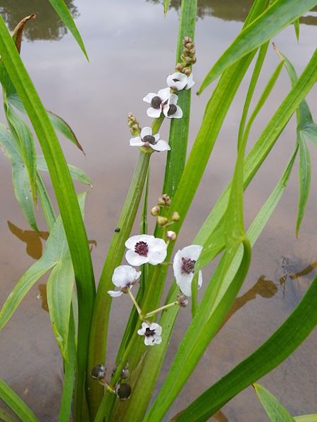 Evropská vodní trvalka se šípovitými listy a bílými květy, ideální pro přírodní výsadby a ekologické zahrady s trvale vlhkým prostředím.