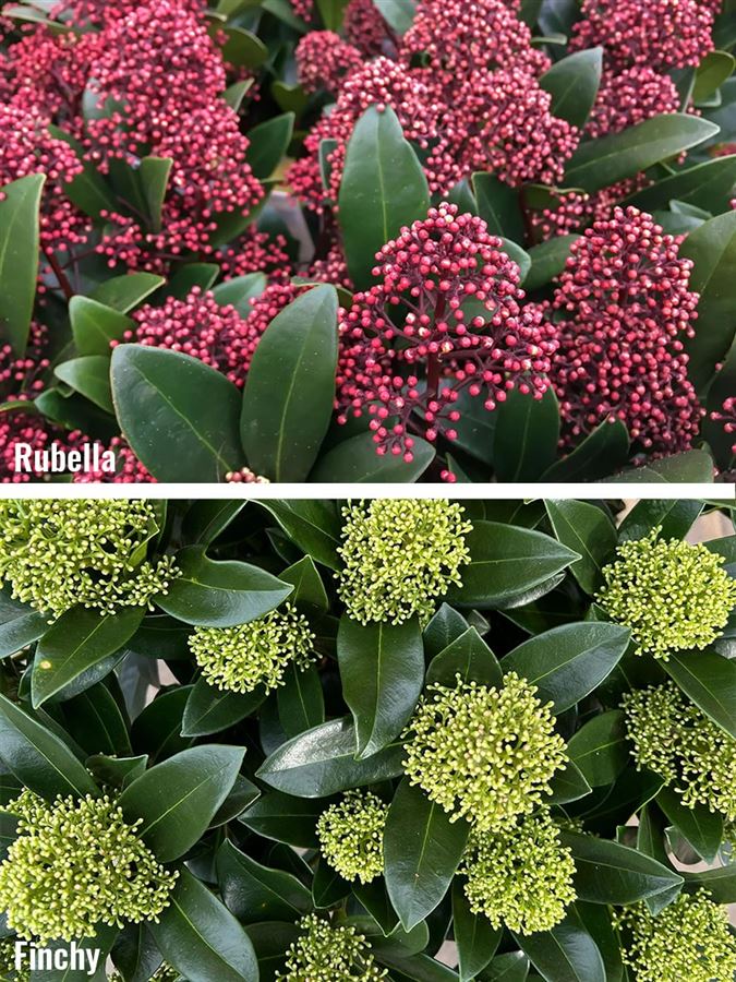 Skimie je sympatický nízký stálezelený keř z Japonska, o který se nemusíte téměř starat, pokud jej dobře zasadíte. Jedná se zde o dva kultivary:  Prvním je Kultivar Rubella který je samčí, má větší listy a bohatší květenství, které vypadá jako načepýřené chocholky a příjemně voní. Funguje jako výborný opylovač pro samičí odrůdy rostliny, ale sám plody nemá.Skimmia japonica 'Rubella & Finchy' je stálezelený keř s tmavě zelenými listy a dekorativními, červenými a bílými květy, které kvetou na jaře. Keř dorůstá výšky 0,5-1 metr a šířky 0,5-1 metr. Preferuje polostinná až stinná místa s kyselou, dobře propustnou půdou.